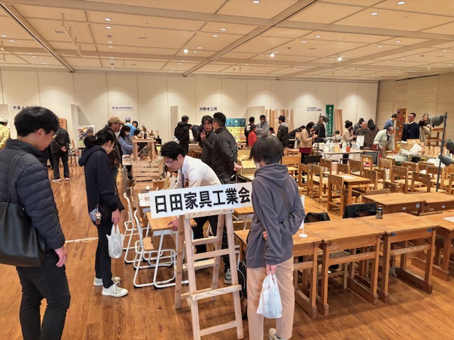 日田家具工業会からは、日田家具の紹介展示と古い学童机等の販売を行った。