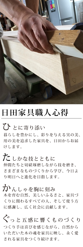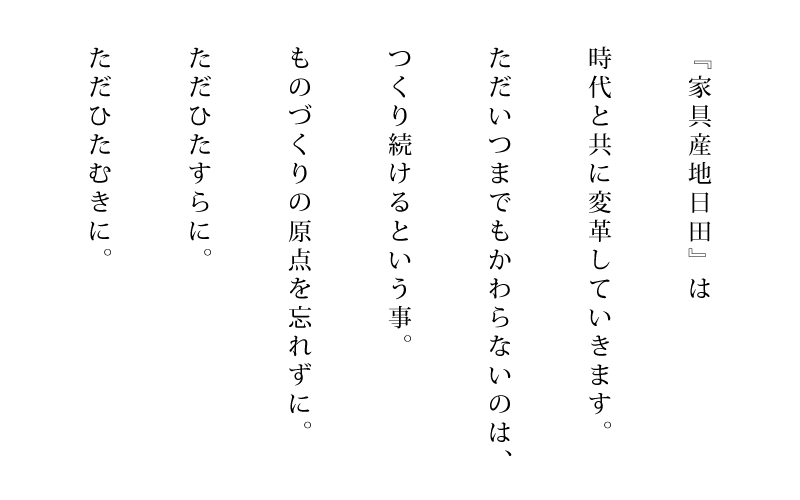 現在では、脚物は大分県日田市、箱物(タンス等)は福岡県の大川市というように全国的にも珍しい家具生産の一大集積地となっています